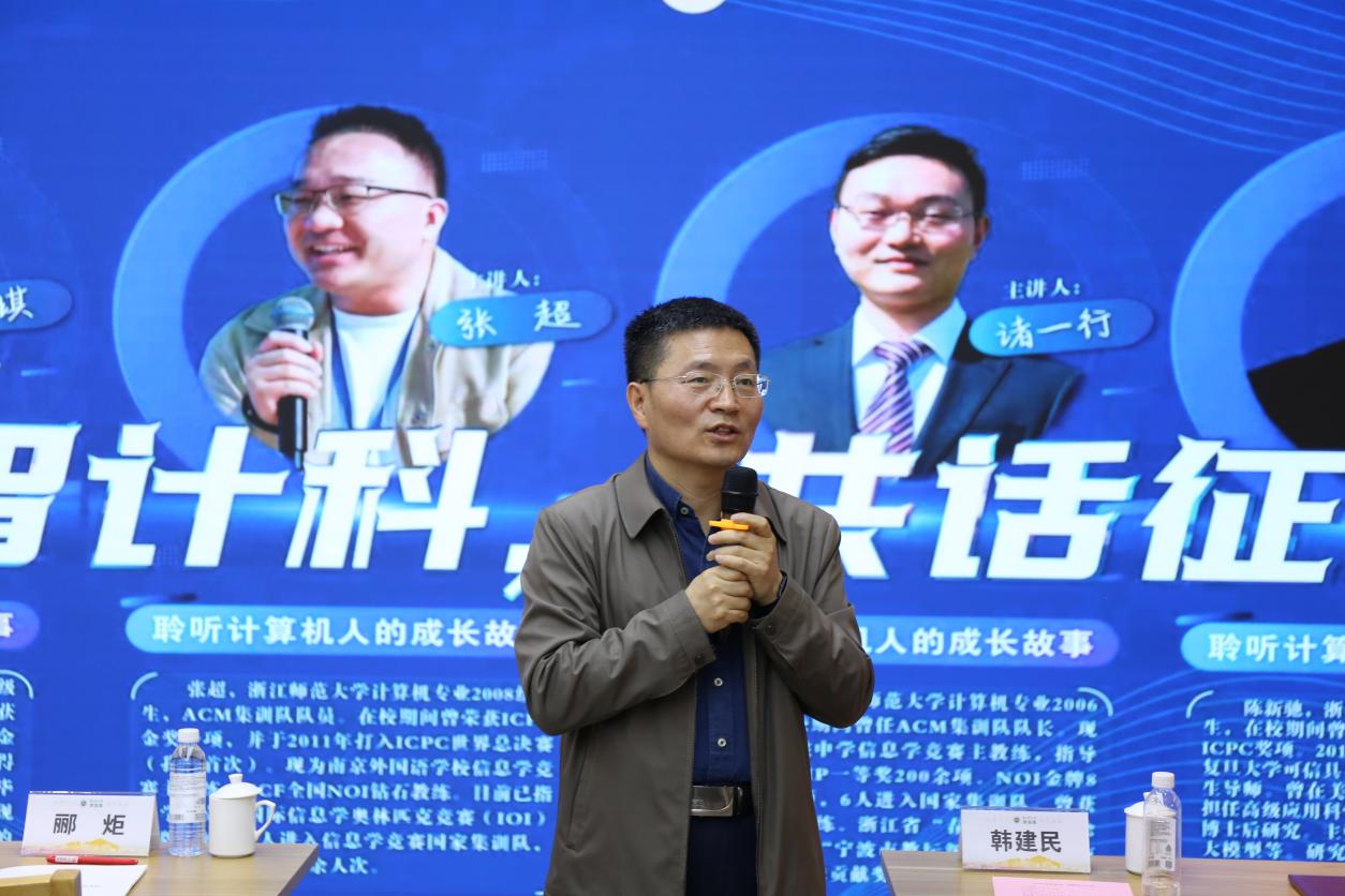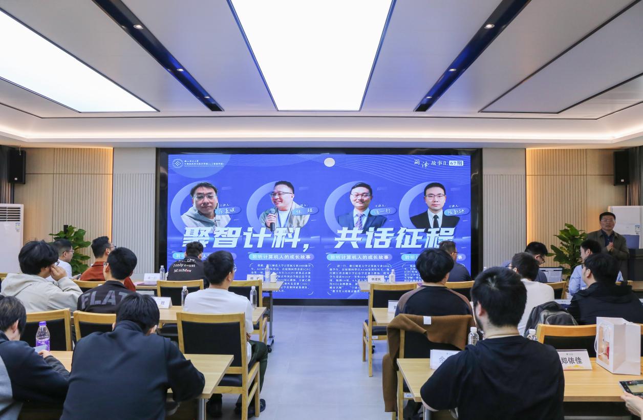 4月19日,在浙江师范大学70周年校庆、计算机学院ACM集训队建22周年双庆之际,由计算机学院承办的第67期丽泽故事在正阳楼召开,本期故事汇特邀的四位嘉宾均是、ACM集训队前队员,分别是学院2017届校友、MiniMax技术总监庄嘉琪,学院2012届校友、南京市外国语学校信息学竞赛主教练张超,学院2010届校友、浙江省余姚中学信息学竞赛主教练诸一行,学院2013届校友、复旦大学可信具身智能研究院青年研究员、博士生导师陈新驰。ACM集训队总教练韩建民教授,ACM集训队历届队员代表、应届全体队员参加活动。